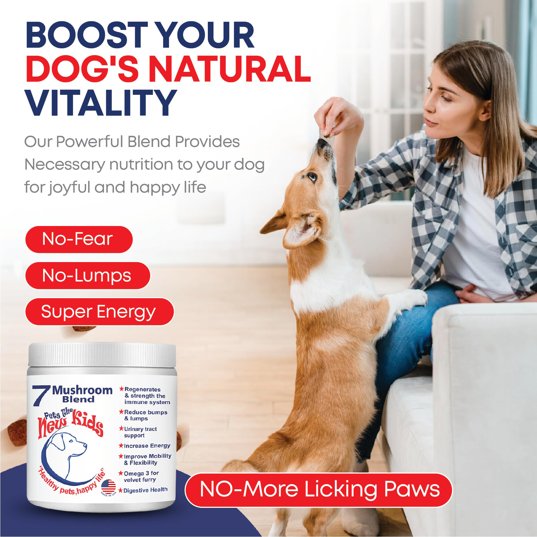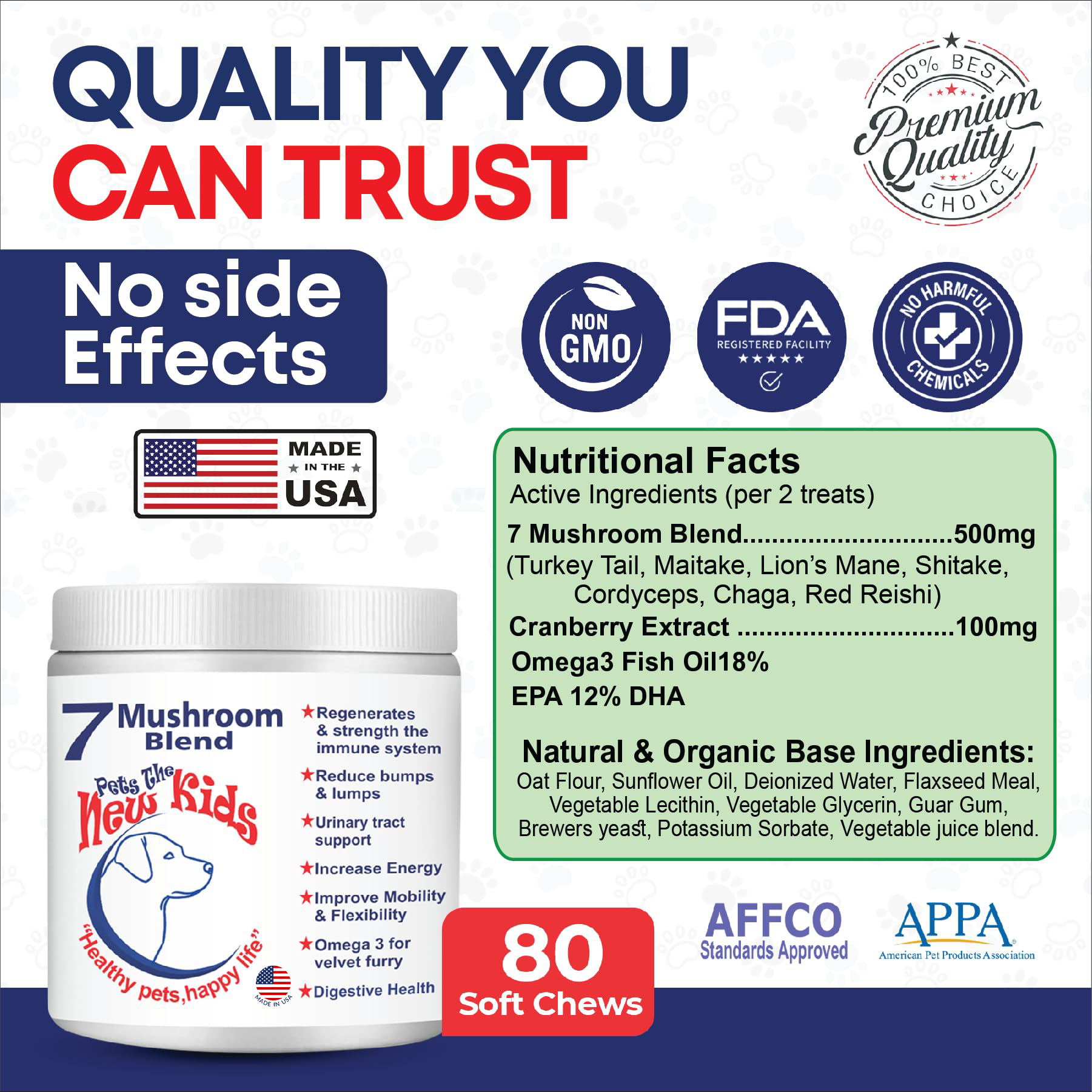 BLEND COMPOSITION: Premium 7-mushroom blend (TURKEY TAIL - MAITAKE - LION'S MANE - SHITAKE - CORDYCEPS - CHAGA - RED REISHI) specially formulated to support dog health, offering natural immune system support and overall wellness benefits. These chews target multiple health issues for your dog, such as improving mobility and flexibility, preventing paw licking, treating bumps and lumps, boosting energy, and providing numerous other benefits!
